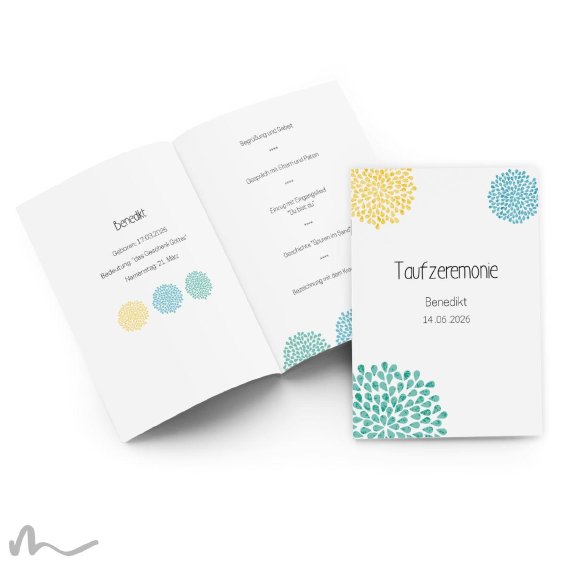 8 bis 16-seitiges Kirchenheft für die Taufe im Format 15 x 21 cm (aufgeklappt 30 x 21 cm). Im floralen Stil mit bunten Blütenkreisen in Gelb, Türkis und Grün. Die Blüten können beliebig umgefärbt werden. Das Wort "Taufzeremonie", der Name des Babys und das Taufdatum stehen zwischen den blumigen Elementen auf dem Cover. Die dezenten Blütenkreise wiederholen sich auch auf den Innenseiten. Dieses Kirchenheft zur Taufe ist farbenfroh und dennoch schlicht. Blumig und erfrischend beschreibt die Designserie "Blütenfeuerwerk" am besten.