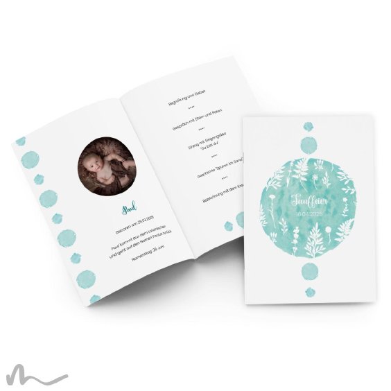 8 bis 16-seitiges Kirchenheft für die Taufe im Format 15 x 21 cm (aufgeklappt 30 x 21 cm). Im malerischen Stil mit türkisen Farbklecksen in Auquarelloptik und floralen Elementen in Weiß. Im großen Farbtupfer steht der Titel "Tauffeier" und das Datum der Taufe. Auf der ersten und letzten Innenseite kann ein Baby- oder Familienfoto eingefügt werden. Auch die Innenseiten werden von türkisen Farbklecksen dekoriert. Dieses Kirchenheft zur Taufe eignet sich besonders für kreative Eltern und Künstler. Modern, malerisch und farblich reduziert beschreibt die Designserie "Farbtupfer" am besten.