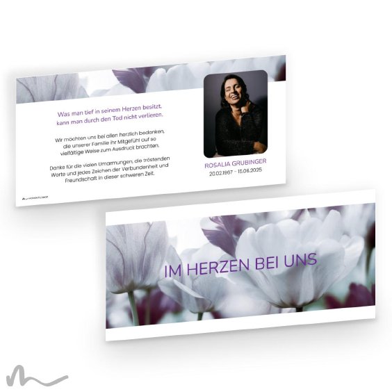 Doppelseitige Trauerkarte im schlichten Stil mit Blumenköpfen in zartem Lila und Weiß. Die Vorderseite wird mit dem Text "Im Herzen bei uns" ergänzt. Die Rückseite dieser modernen und weltlichen Trauerkarte bietet Platz für einen schönen Trauerspruch und liebevolle Dankesworte an die Trauergäste. Zusätzlich kann ein Foto der verstorbenen Person, der Name sowie das Geburts- und Sterbedatum eingefügt werden.