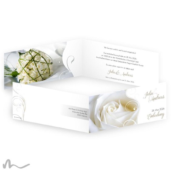 Hochzeitseinladung mit vier Seiten im Format 21 x 10 cm (40 x 10 cm aufgeklappt). Im eleganten Stil mit einer weißen Rose, die von verspielten Schnörkeln eingefasst wird. Neben der Blume und den Ranken stehen die Namen von Braut und Bräutigam, das Hochzeitsdatum sowie das Wort "Einladung". Die Adresse des Brautpaares kann auf der Rückseite eingefügt werden. Auf den Innenseiten verzieren elegante Schnörkel und ein mit Ranken maskiertes Bild von einem Rosenstrauß die Einladung. Alle Fotos können gegen eigene Bilder getauscht werden. Diese Hochzeitseinladung passt sehr gut zu edlen Hochzeiten. Elegant, farblich zurückhaltend und etwas verspielt beschreibt die Designserie "Imago Rose" am besten.